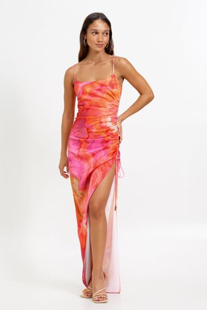 Showcasing our beautiful vibrant print, the Zanna Dress is the perfect outfit for any occasion. Featuring a scooped neckline, adjustable straps and a drawstring down the left side leading to our signature thigh high split. The ruching across the body flatters the wearer and provides ultimate comfort.